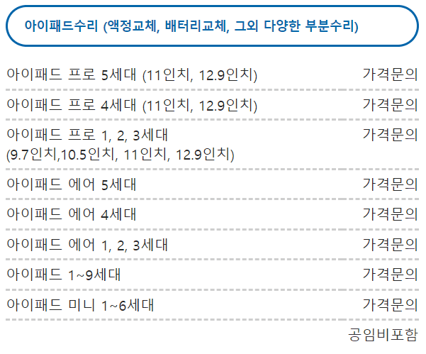 방문시 당일수리를 원칙으로 하고 있으며 평균 30분 이내 소요, 침수 또는 아이패드 수리시 추가 시간이 발생하는 경우도 있습니다.